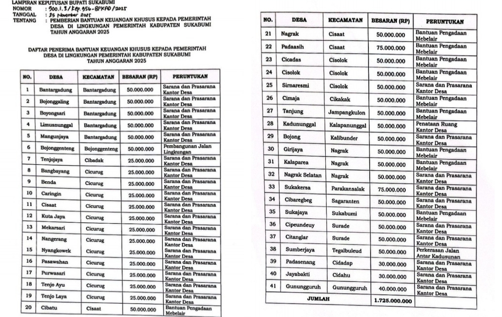 SUKABUMISATU.com – Di tahun anggaran 2025 Pemda Sukabumi memberikan bantuan pada beberapa desa melalui mekanisme Bantuan Keuangan Khusus dengan total 1.725.000.000