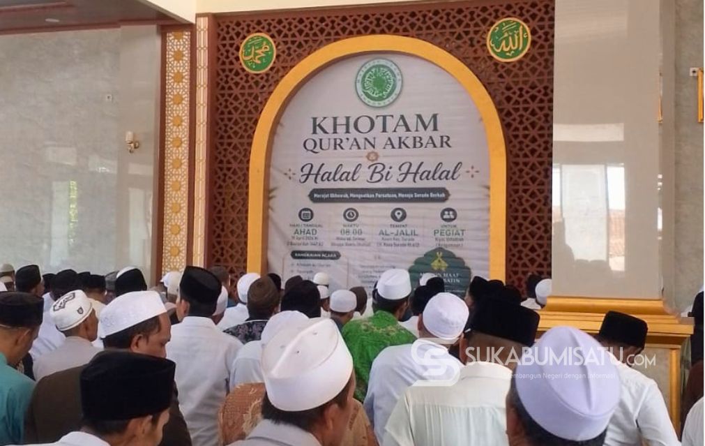 SUKABUMISATU.COM, SURADE – Ribuan kiai, santri, serta tokoh masyarakat memadati Masjid Besar Al-Jalil, Kecamatan Surade, Kabupaten Sukabumi, Minggu (19/04/2026). Perhelatan akbar bertajuk Khotam Qur’an Akbar dan Halal Bi Halal ini mencatatkan sejarah baru dengan kehadiran ribuan ulama se-Kecamatan Surade.