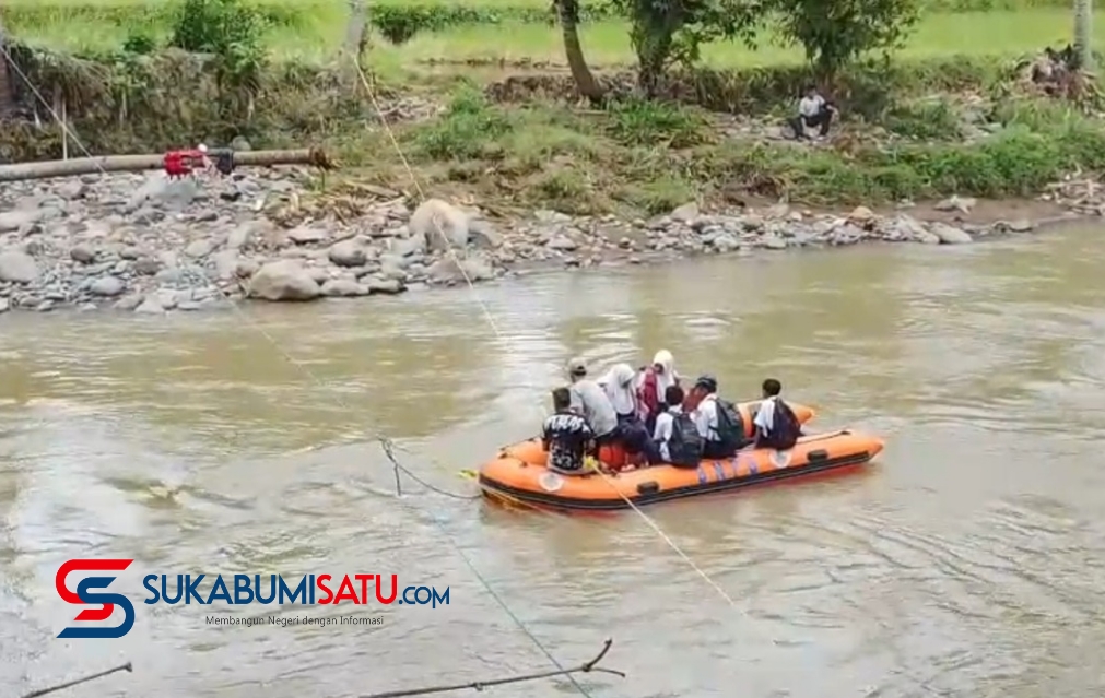 ​Rusaknya jembatan gantung yang menghubungkan Desa Tanjungsari (Kecamatan Jampangtengah) dengan Desa Sirnaresmi (Kecamatan Gunungguruh) memaksa para pelajar bertaruh nyawa. Tanpa jembatan sepanjang 48 meter itu, satu-satunya cara tercepat menuju sekolah adalah dengan menaiki perahu karet bantuan dari BPBD Kabupaten Sukabumi.
